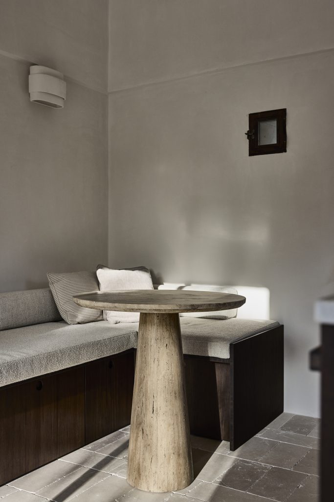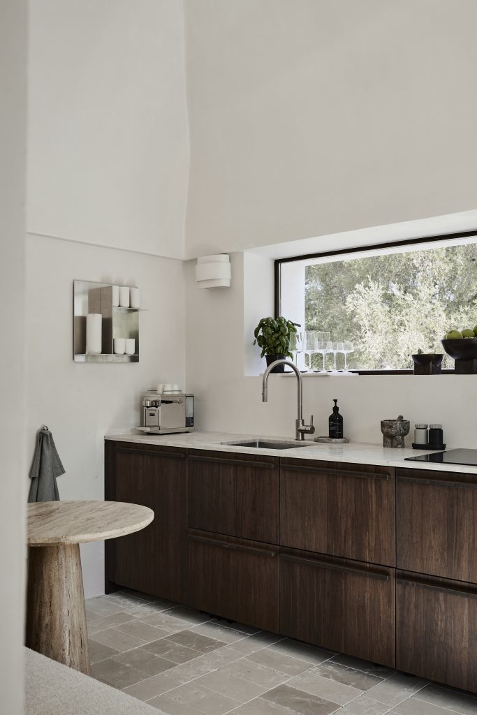 The compact layout was reimagined to create a sense of openness and flow, with vaulted ceilings in the kitchen adding volume and warmth. A custom window was introduced to frame views of the plunge pool and olive garden, turning the landscape into a living artwork. The kitchen, designed as the heart of the home in collaboration with AskogEng, features a marble backsplash and a long dining table that stretches toward the garden. A custom pass-through window connects directly to the outdoor dining area—a standout detail that enhances the flow and invites natural light, creating a seamless dialogue between interior and exterior living.