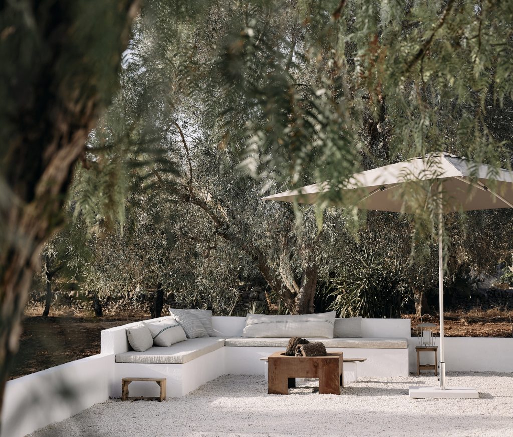 Outside, a handmade dining table sits beneath ancient olive trees, inviting slow meals and shared moments. The transition between inside and out is effortless, with architecture and nature blending into one continuous experience. The bathroom features a custom marble sink and refined finishes, combining tactile elegance with a boutique sensibility.